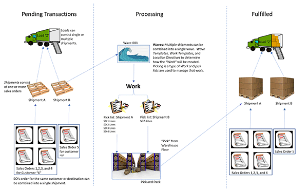 This nested, hierarchical relationship must be created for shipping waves and work to be created. Consider a wave as instructions to the warehouse as to how to fulfill a sales order, shipment, and/or load. These instructions include “work” which represents lines on a pick list(s) for shipment(s). Once the work is completed (picked and packed), the truck and shipment are now full and ready to be shipped to the customer.